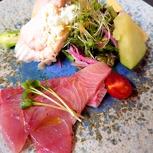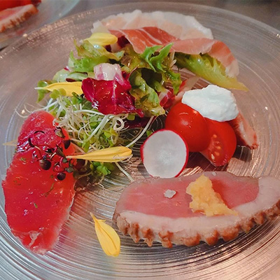 - 〇 本日の鮮魚カルパッチョとおまかせ野菜のフリットとスペイン産ハモンセラーノ(生ハム)