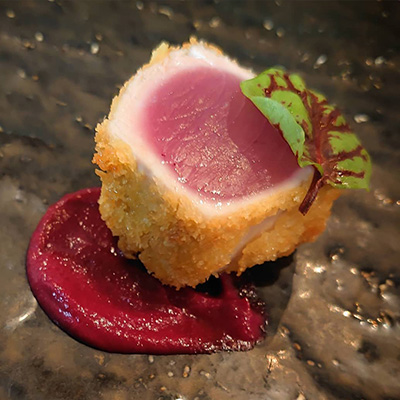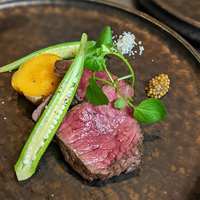 - 〇 養老山麓豚のボロネーゼを詰めた肉厚しいたけのグラタンと茨城県産シラウオのセモリナ粉フリット